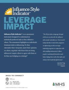 The Influence Style Indicator is an assessment instrument designed to understand an individual’s preferred style as they influence others. The assessment addresses one’s preferred, secondary, and underutilized influencing styles.