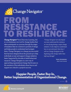 Change Navigator is a revolutionary new tool for change leaders that takes participants on a journey through the stages of transition that are common to periods of change and helps people to understand and navigate them. It focuses on the emotions of individuals as they navigate change and the predictable stages of transition.