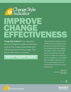 The Change Style Indicator measures an individual’s preferred style in approaching and addressing change. It provides leaders and team contributors insight on personal preferences for managing change and context for how those around them might perceive and respond to a preferred style. The Change Style Indicator’s 20 helps establish how the respondent prefers to address and work with change – addressing both initiated and imposed change. A key piece of insight is the participant’s place on a continuum along a Conserver, Pragmatist and Originator spectrum.