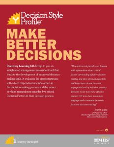 The Decision Style Profile® poses ten typical, real-world business situations that require decisions. Based on the cases as presented, the respondents choose among five decision-making styles in selecting the one they believe is most appropriate for each case. The five styles differ in the degree that the respondent may choose to involve others in the decision-making process. A personal report for each respondent compares individual choices to the “expert” style choices made by 20,000 executives and mid-level managers. The report includes Decision Inclusion Index scores and an explanation of Decision Style preferences.