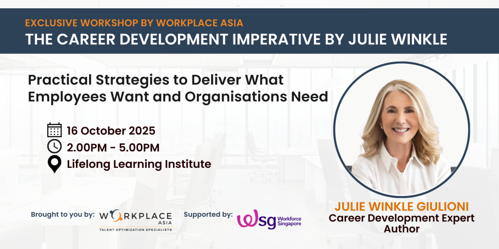 The trainer for this workshop is Ms Julie Winkle Giulioni, the author of Promotions Are So Yesterday: Redefine Career Development. Help Employees Thrive and the co-author of the international bestseller, Help Them Grow or Watch Them Go: Career Conversations Organizations Need and Employees Want.